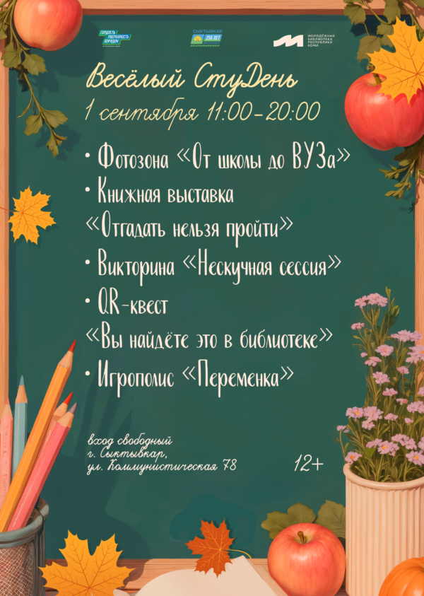 1 сентября – важный праздник для школьников и студентов России. Ко Дню Знаний Молодёжная библиотека Республики Коми проводит акцию «Весёлый СтуДень». Участники не только весело встретят первый день осени, но и настроятся на учёбу.