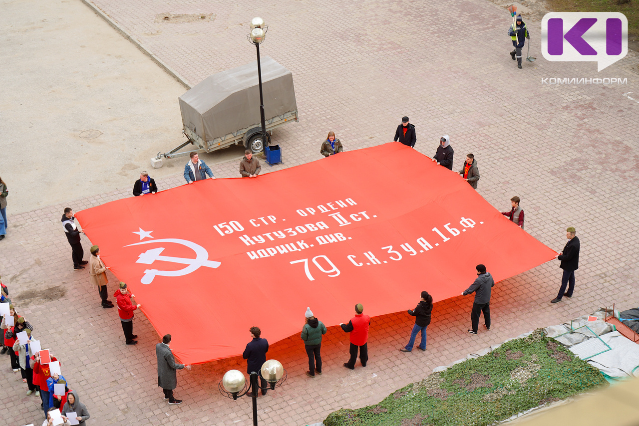 Под руководством организаторов участники выстроили живую композицию в форме числа «80», держа над головой красные картонные листы. Рядом развернули гигантскую копию Знамени Победы.