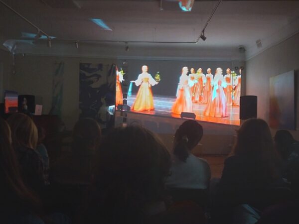 После экскурсии посетителей пригласили в соседний зал с проектором, где и прошла основная часть творческой встречи. Все сидячие места оказались заняты, пришлось приносить стулья из других залов.