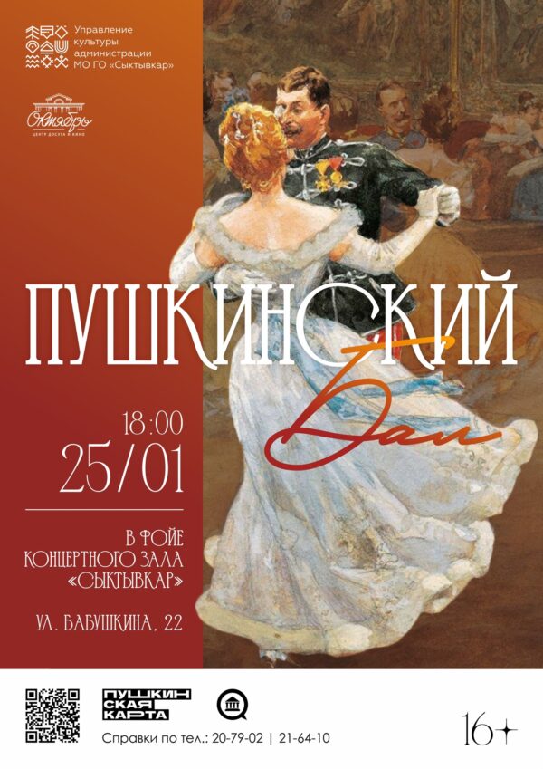 25 января в 18 часов в фойе Концертного зала «Сыктывкар» состоится «Пушкинский бал» – грандиозное событие зимнего сезона, приуроченное к Татьяниному дню и году А.С. Пушкина в России. Великолепная атмосфера бала перенесет гостей в эпоху XIX века, где танцы тонко резонируют с душой и культурой России.