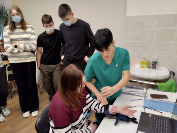 Кроме того, ребята посетили кабинеты, предназначенные для реабилитации пациентов после инсультов, операций на опорно-двигательном аппарате, нейрохирургических операций. Участники экскурсии попробовали выполнить задания на тренажерах и системе виртуальной реабилитации Nirvana, побеседовали с психологом, логопедом, а также врачом отделения Павлом Чупровым, который рассказал, в чем состоит работа специалистов отделения.