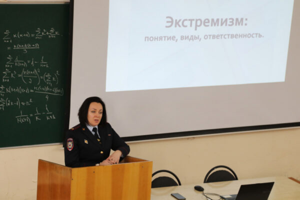Старший оперуполномоченный Центра по противодействию экстремизму МВД по Республике Коми Ирина Рубцова и член Общественного совета при региональном ведомстве Николай Бушманов провели для студентов 1 курса Сыктывкарского лесного института лекцию на тему «Предупреждение и пресечение распространения среди студентов экстремистских и радикальных взглядов, в том числе идей неонацизма, недопущения вовлечения студентов в незаконные публичные мероприятия и иную протестную деятельность».